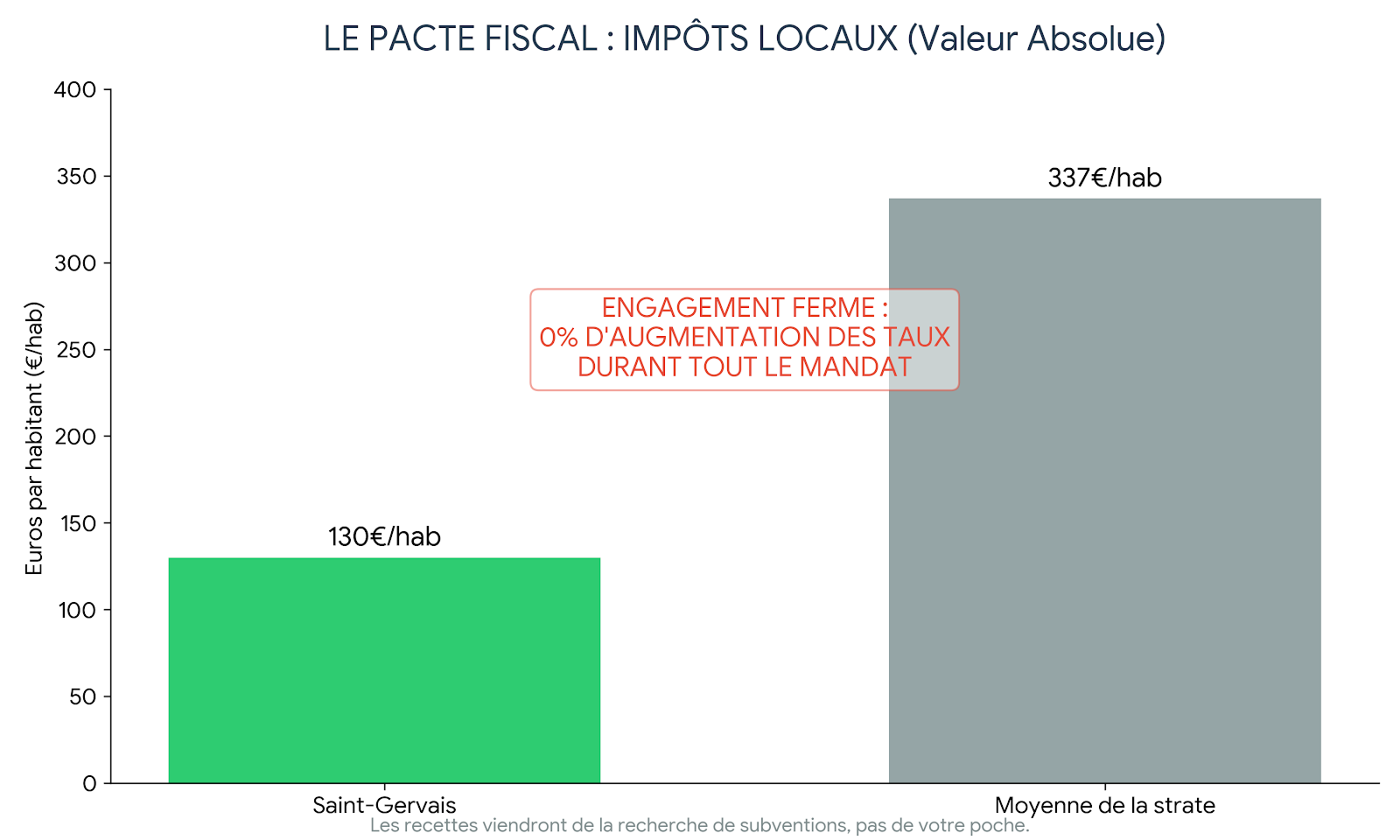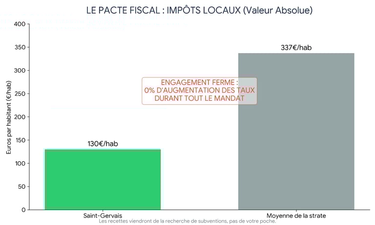 Nous ne recruterons pas à tour de bras. Cependant, nous étudierons la possibilité de mutualiser davantage des services techniques avec des communes voisines ou la Communauté de Communes pour avoir accès à du matériel performant plus régulièrement (épareuse, balayeuse) sans alourdir nos charges fixes.La pression fiscale à Saint-Gervais est légèrement supérieure à la moyenne (+1,46%), bien que les impôts locaux en valeur absolue (130€/hab) restent inférieurs à la moyenne de la strate (337€/hab).