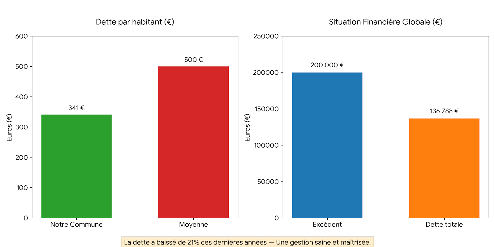 Il faut rendre à César ce qui est à César : la gestion passée a été économe avec un excédent de 200.000€ et un encours d’endettement de 136.788€. La dette est maîtrisée (341 €/habitant contre 500 € en moyenne) et elle a baissé de 21 % ces dernières années. C’est remarquable !